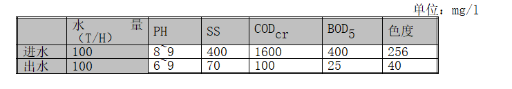 根據建設方提供的數據及相關行業的資料,出水排到附近小河。出水水質達到《紡織染整工業污染物排放標準》GB4287-92中一級排放標準,設計進出水水質如下: