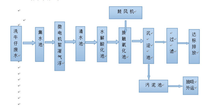 牛仔服生產后整理的關鍵工序是通過普洗、酵洗、扎洗、石磨、氧化還原、石染、普染等工藝可以使牛仔服達到磨損、脫色和斑駁等特殊效果?。漂洗廢水來自牛仔服的漂洗和脫水過程。污染物主要是浮石渣、短纖維和從牛仔服中水洗下來的染料、漿料以及各種助劑。廢水特點是懸浮物、膠體物、無機鹽濃度高,顏色呈藍黑色,污染物成分由于生產工藝的不同而存在很大差異。由于生產所用的染料如靛藍染料、硫化染料、活性染料和助劑(PVA、增白劑、表面活性劑等)均是難降解物質。因此.目前產業界普遍采用混凝預處理與生化處理相結合的工藝以實現其達標排放。