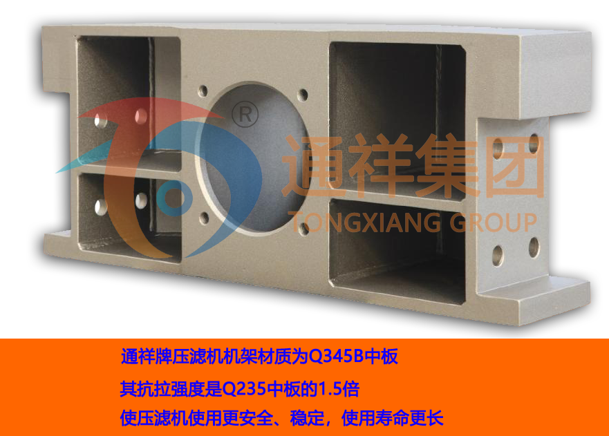 1.“通祥集團”壓濾機機架材質為Q345B中板,其抗拉強度是Q235 中板的1.5倍,使“通祥牌壓濾機”壓濾機使用更安全、穩定,使用壽命更長。